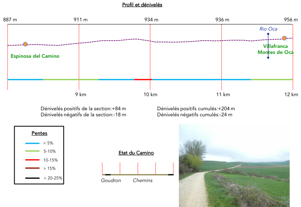 Dans cette très longue étape, la très grande partie du trajet se passe encore sur les chemins. En Espagne, en dehors des villages et des villes, les routes goudronnées, pour la grande majorité, comportent des bandes herbeuses ou de terre sur les bas-côtés. Ainsi, le Camino francés est avant tout un vrai chemin, si on le compare aux autres chemins de Compostelle en Europe, où les parcours ne sont qu’à moitié sur les chemins :