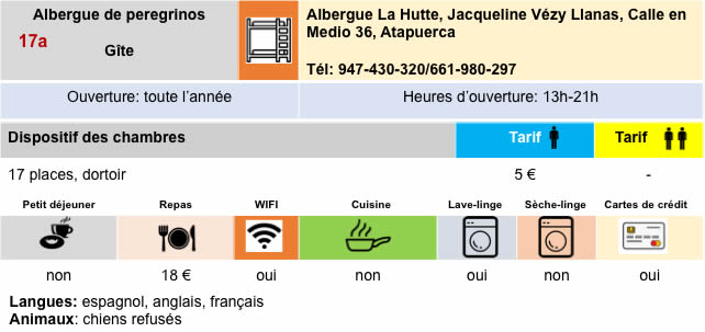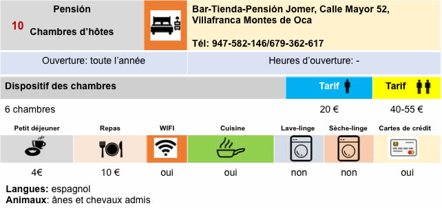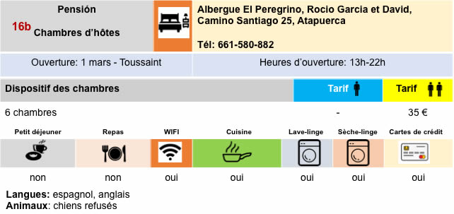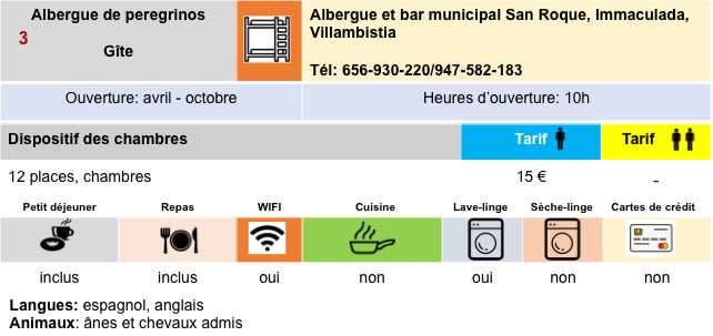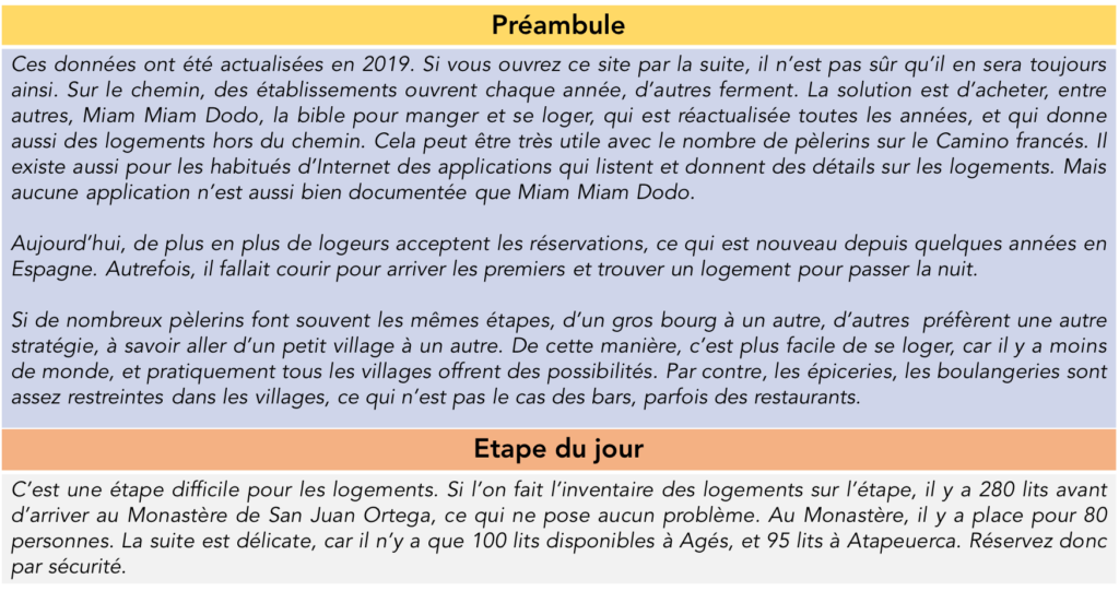 | Les capacités d’accueil ici sont limitées. Le village, dont surtout l’hospice des pèlerins faisant partie du monastère, ne peut accueillir qu’une septantaine de pèlerins. Les autres, qui n’ont pas eu de chance ou qui n’ont pas réservé vont plus loin sur le chemin, à Agués ou Atapuerca. |