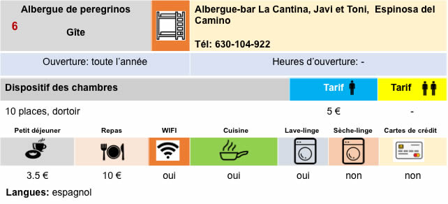 | Ces auberges de village sont le nerf de la guerre sur le chemin. On peut y dormir, déjeuner, manger, mais elles servent aussi souvent d’épicerie, car il faut bien le dire, les épiceries font souvent défaut sur le chemin. Mais on n’y meurt ni de faim ni de soif. |