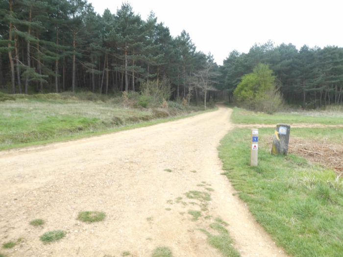 | The pathway is wide in the soft and relaxing pine forest. It is again and also the route taken by the European route N01 to Portugal. |