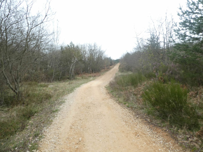 | A real dirt highway, sometimes ocher sometimes beige, leaves in the big forest. You may scrutinize behind the trees. No wolf, no highwayman, disturbs the harmony of the trees. And then, you feel reassured, there is the high-voltage line, and right next door, parallel, N-120 road. |