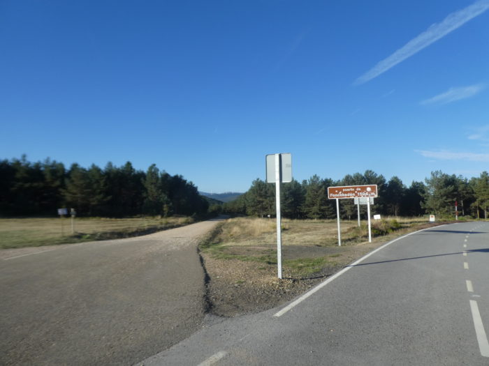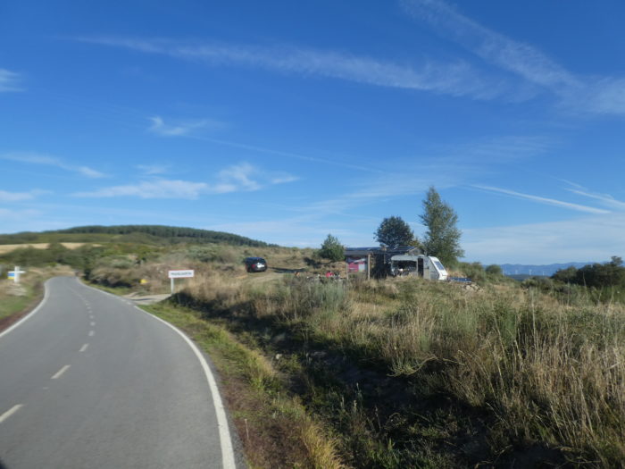 | Plus haut, le chemin croise la route du col, passe de l’autre côté. À 232 kilomètres de Santiago. |