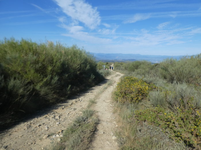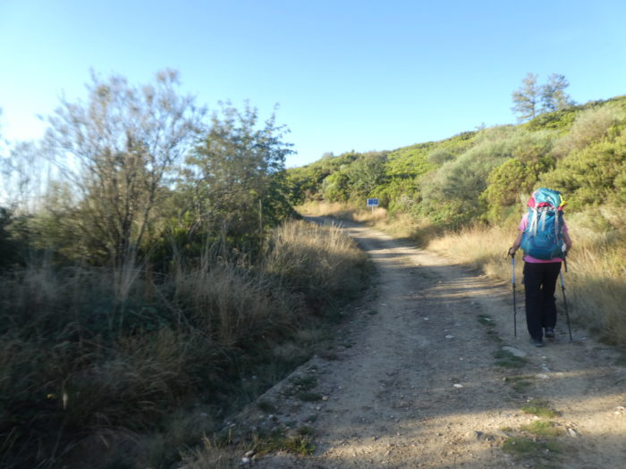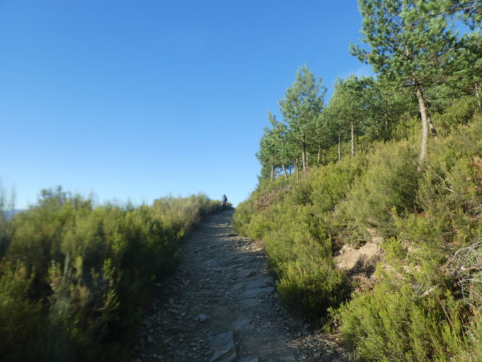 | Plus bas, vous allez goûter d’une pause méritée. Le chemin se traîne sur la crête. Ici, un pèlerin a dû se dire qu’il était plus confortable d’avancer pieds nus. |